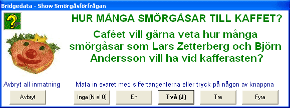 Som extra funktion kan cafépersonalen fråga hur många smörgåsar som skall fixas på ett ungefär. Svara med siffror, J, N eller tryck på någon knapp. |