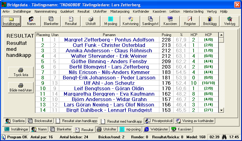 Här kan man kontrollera resultatet. OBS! Handikapp automatiskt för paren!